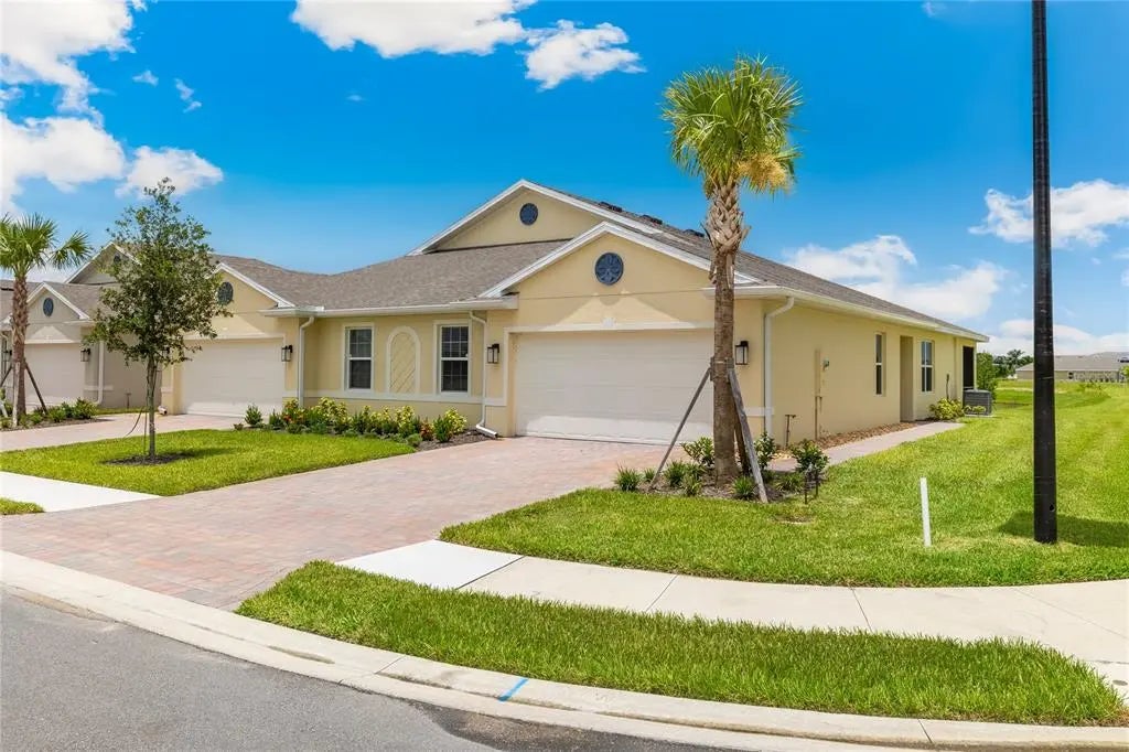 Welcome to the Cove of West Port Community featuring Resort Pool, Club House, Pickle Ball, Bocci Ball, Dog Park & Gate. This stylish twin villa home features an open-concept design that makes gathering with friends and family a breeze. The well-appointed kitchen features an ample counter space including a breakfast bar for eating. The kitchen seamlessly flows to the dining and living areas. Sliding glass doors open from the living room to the covered lanai extending the living space outdoors and provides the perfect place for relaxing or dining al fresco. An expansive primary bedroom, situated at the back of the home for privacy, includes an en-suite bathroom with double vanity and walk-in shower. The guest bedroom features a walk-in closet and is in close proximity to the second bathroom. A den with double doors can be utilized as a home office or cozy living area. A two-car garage and laundry room complete this home. Interior images are of model home.