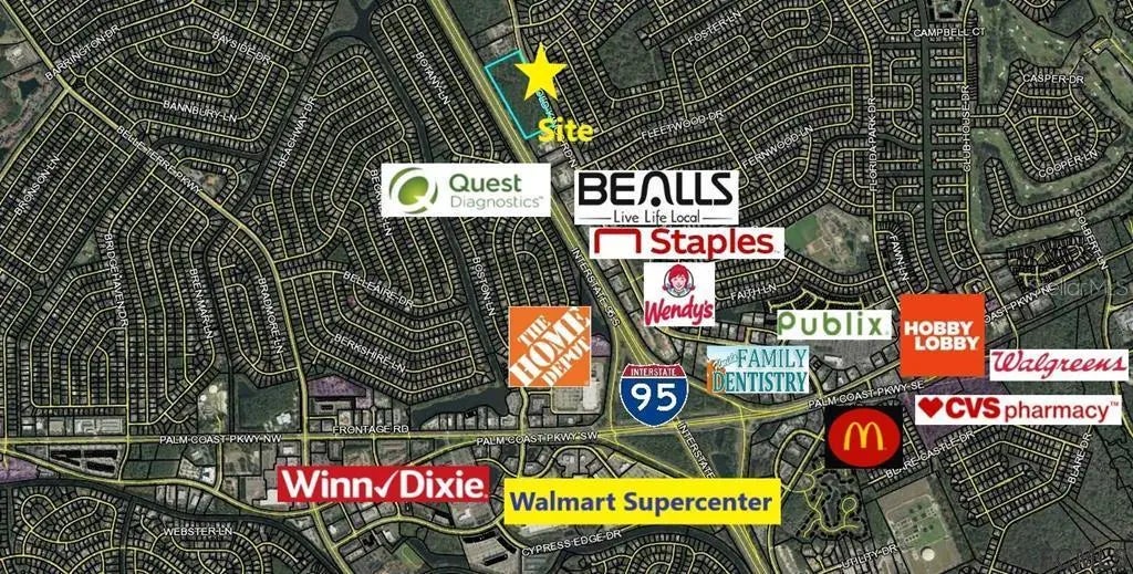 Under contract-accepting backup offers. 15+ Acres, Zoned for Commercial use. Frontage 1,300' on Old Kings Rd and rear exposure 1,300' on I-95. Versatile use: Retail, Food and Beverage, Medical and other options. Largest available parcel in central commercial corridor surrounded by one of the most densely populated areas in Palm Coast. Close to I-95 interchange and the intersection of Palm Coast Pkwy and Old Kings Rd. Versatile development options ranging from retail to medical to hospitality and more. Utilities available at site.