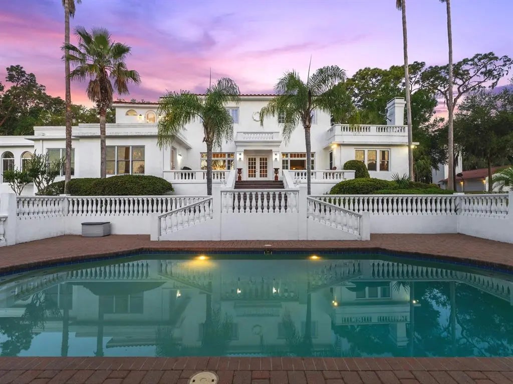 Come, step back into time to a magnificent waterfront Mediterranean estate that is perfectly positioned on 6 acres and 442 feet of direct frontage on pristine spring fed Lake Dalhousie where residents enjoy swimming, fishing, boating, water skiing and kayaking. A true retreat from the city life and one of the prettiest areas in Lake County. It enjoys the best of both worlds, uncrowded, peaceful country living, but close to shopping, major highways and the beaches. The grounds are enchanting but become sublime as you take in the spectacular early morning sunrise and golden hour that reflects on the home in a rich fairy tale glow. Stroll through the grounds where you will find stately grandfather oaks, bricked walkways, 1926 domed pavilion and emerald lush gardens all irrigated from the lake. You will notice the original 4-story water tower which, is no longer in use but stands tall capturing attention, making it one of the homes most iconic features. Commissioned with grandeur and built to endure in 1926 by Dr. Edgar J. Banks, a noted archeologist who began coming to Eustis in 1916 and today, this spectacular Mediterranean is ready to celebrate her 100th year old birthday. A peaceful courtyard entry with a stately fountain, loggias and Mahogany glass door entry add to the excitement and hint at the elegance within. Approximately over 6,200 square feet of living area consist of 2 master suites, 4 guest bedrooms and 5 1/2 baths. Upgraded plumbing and electric, volume ceilings, graceful arches, beautiful oak wood flooring, ornate fireplaces, large baseboards, iconic chandeliers, original Tudor style windows and newer windows that include Pella, Andersen, Marvin and Jeld-Wen, blend period charm with newer and modern conveniences. The grand ballroom overlooks the lakefront and features large parquet flooring and cherry wood inlay. The volume ceilings are graced with beautiful chandeliers, decorative hand carved plaster border and showcased with a handsome Artisan European gas fireplace. French doors open wide to the outdoor terrace which overlooks the 20x40 inground pool with stone paver decking, and mesmerizing views of the lake. The formal dining room features parquet flooring, Tudor style windows, coffered ceilings and original gas fireplace with a white mantle that has been delicately carved with the words Dolce Far Niente, meaning Sweetness of Doing Nothing. The generous kitchen, breakfast room and family room overlook the lakefront and have been completely redesigned with oak flooring, Quartz countertops, stainless steel appliances, French Country cabinetry and marble backsplash. The exterior back of the home stands tall and magical and features a magnificent focal point, designed with an abundance of white balustrades, the 20x40 inground salt pool, a terrace that spans the back of the home and a private master suite second story balcony. Perfectly designed for grand scale entertaining or tent the lawn for a beautiful outdoor wedding. The back yard features a gentle slope to the lakefront with long extended dock and a boathouse that currently houses a 21-foot boat and room for another. The main house features a 2-car garage, and another 4-1/2 car garage was added to the 4-story water tower. Other highlights include a very clean and neat large basement with upscale Kinetico water system and other mechanicals. This is a rare opportunity to own an original and architecturally stunning Mediterranean period home that seldom comes to market.
