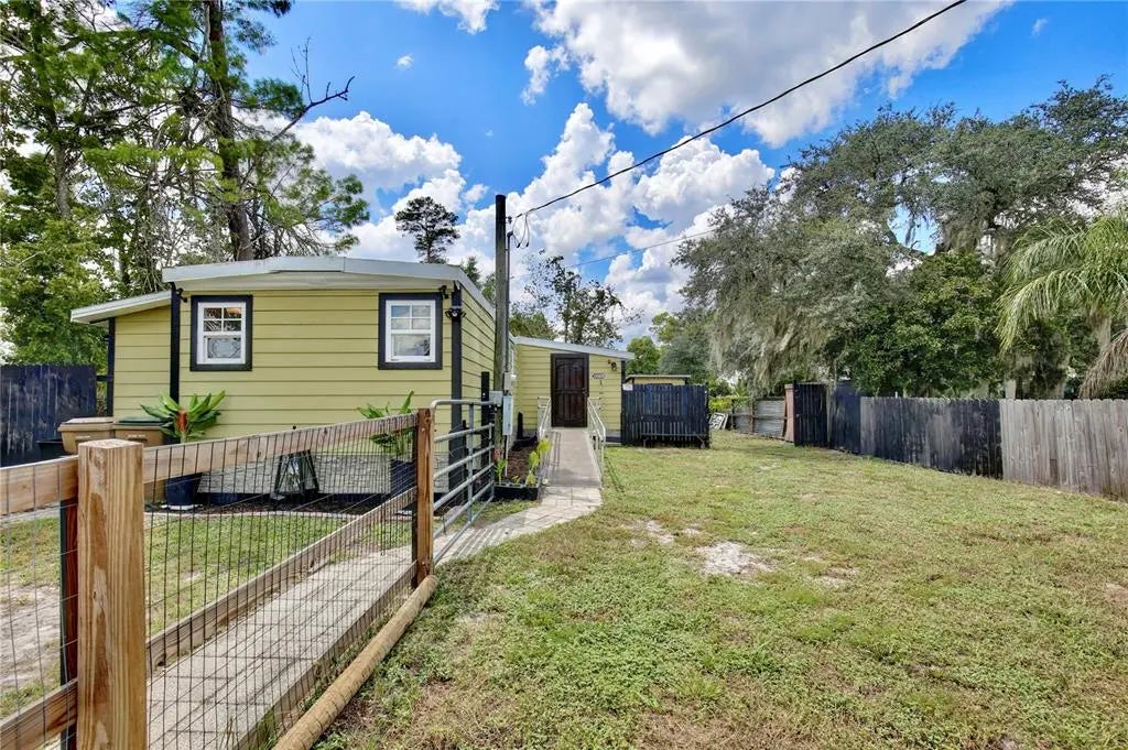 Welcome home! Situated for serenity, yet only a twenty minute drive to downtown DeLand's bustling shops, dining, Stetson University, and Blue Spring State Park, this home offers the best of both worlds, providing you with the perfect backdrop for beginning your homeownership journey. Upon arrival, you're greeted by a handicap-accessible wheelchair ramp leading to a spacious foyer, which doubles as a sunroom. Imagine this space adorned with vibrant plants and comfortable seating, a serene spot to welcome you home. As a functional entry point, it also serves as the perfect drop zone for shoes and bags. Step into the heart of the home, where the great room awaits. This versatile space is bathed in natural light, with a sunny dining nook beside a window, a living area with a sliding barn door, and a kitchen that's sure to inspire your culinary creations. The kitchen features stainless steel appliances, granite-styled counters, shaker cabinets, and a coffee/beverage station. Retire to either of the tranquil bedrooms, one featuring a walk in closet so spacious it's currently enjoyed as a bonus lounge area. The bathroom adorned with oil-rubbed bronze hardware and custom paneling offers a classic tub/shower combo. An indoor laundry room complete with a GE washer and dryer offers added convenience, while the fully fenced yard invites endless opportunities for outdoor living. The patio area features a sink and leads down to the chicken coop and shed—perfect for the aspiring gardener or homesteader. Explore the space through the 3D virtual tour and schedule your showing today to take the first step towards creating your dream home!