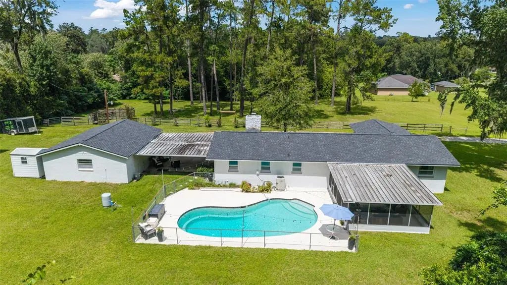 Property on almost 4 acres in SW Ocala offers the perfect blend of comfort, space, and country charm. This ranch-style home features 4 bedrooms, 2 bathrooms, and over 2,000 sq ft of living space. Inside, the open layout highlights a beautiful stone fireplace, kitchen with granite countertops, and a bright split-bedroom design. Step outside to enjoy a screened patio, private in-ground pool, and wide-open pastures with a two-stall barn, detached garage, and storage shed. With no HOA or deed restrictions and just minutes from shopping, dining, and I-75, this property delivers both privacy and convenience.