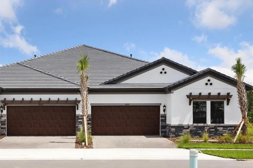 Vinoy - Luxury Villa Life is redefined in this Vinoy Villa in the highly sought after Two Rivers West Community, where quality craftsmanship meets thoughtfully designed living to match your upscale and low-maintenance lifestyle. This pond view, 2-bedroom, 2.5-bath home with a versatile den offers 2,160 Sq. Ft. of open-concept layout with 10’ ceilings that blends indoor elegance with outdoor relaxation through your expansive 12-foot sliding glass doors that open to your private outdoor living area. The gourmet kitchen is a true centerpiece, boasting a large island with generous storage, GE stainless appliances, sleek whte cabinetry with modern lines, Telluride Daltile 3CM quartz countertops and stylish wood-look luxury vinyl plank flooring with carpet only in the bedrooms. Quality finishes include tray ceilings in the foyer, den and owners retreat along with WestBay’s infamous included trim package. Additional storage features, include a walk-in Pantry, walk-in closets at the Owners Retreat, On-Suite, Den and additional storage space in your garage that offers 10’ ceilings, GE Energy Star-rated water heater and pre-plumbing for a whole-house water filtration system. This is a maintenance free community which means your exterior maintenance is cared for, including your lawn, landscape, irrigation, weed & feed with exterior pest control, exterior paint and roof replacement, plus Ultra-Fi internet—allowing you to focus on enjoying life. Located in Two Rivers West, this vibrant, community features scenic nature trails and outdoor amenities, creating an ideal environment for families and active lifestyles with a future Landing At Two Rivers coming in Fall of 2026. You'll be minutes from Wesley Chapel’s premier shopping and dining, with easy access to Tampa’s top attractions. Price includes premium pond-view lot, structural enhancements, and designer-selected upgrades. Exterior image is for illustration only and may vary from the final home. Completion date estimated for June 2025 is subject to change.