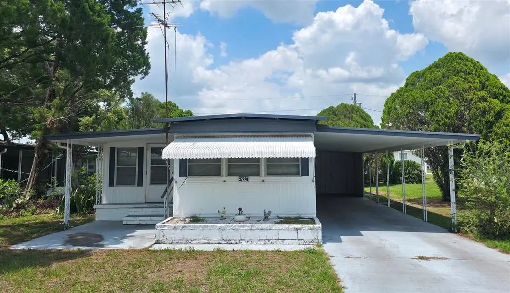 Singlewide with addition in Betmar Acres. 2 bedrooms 1.5 baths. Open concept front floorplan features combined living room with vaulted ceiling and eat-in kitchen. Spacious 10x36 add on Florida room with closet and 1/2 bathroom. Cozy guest bedroom with built-in dresser & closet. Full hall bathroom features double sinks, tub with shower surround, built-in cabinetry and linen closet. Comfortable primary bedroom with closet, dual built-in dressers and vanity area. Exterior features include aluminum siding, metal roof over, painted driveway, sidewalk & covered front porch, long carport with space for 2 vehicles, attached utility room with washer/dryer + a freestanding shed for additional storage, umbrella clothesline, central HVAC + supplemental wall unit in kitchen. Furnished as shown including all major appliances. Situated in Betmar Acres—a vibrant, friendly 55+ community where you own your land. Low annual park dues of only $423 make it an appealing choice for those seeking an active lifestyle in the Sunshine State. Betmar Acres offers a wide range of activities & amenities including bingo, dances, indoor shuffleboard, two swimming pools, two hot tubs, organized monthly activities, three nine-hole golf courses, miniature golf, park library, horseshoes, pickleball, tennis, bocci ball, basketball court, gazebos, fenced pet play area & walking paths. This community has it all for your entertainment. Call today to schedule your private tour.