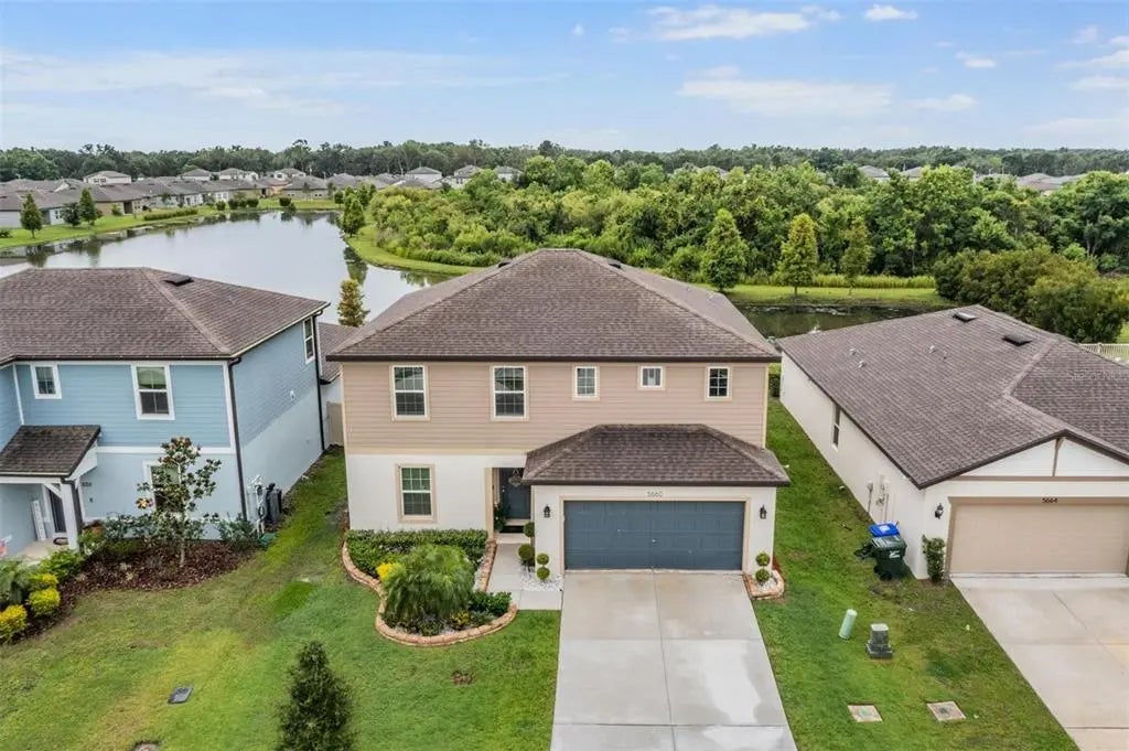 Welcome to this beautifully maintained 5-bedroom, 3-bathroom home in a serene Southwest Lakeland community. Backing to a lush lake/pond, this spacious home offers 2,415 square feet of well-designed living space. Inside, you'll find updated tile flooring in the living area, a custom coffee bar, built-in entryway storage, and fresh interior paint. The kitchen features granite countertops and flows into open living and dining areas. Two bedrooms include custom closet systems, and the entire home is fenced for added privacy. Additional upgrades include a water softener system, an enclosed lanai, and a garage equipped with bike hangers and an app-controlled door for convenience and security. The low HOA community offers two swimming pools, a dog park, and a clubhouse available for events. Conveniently located near Loyce E. Harpe Park, Holloway Park, Lakeside Village, Polk Parkway, and I-4, this home offers easy access to outdoor recreation, shopping, dining, and quick commutes to Tampa and Orlando.